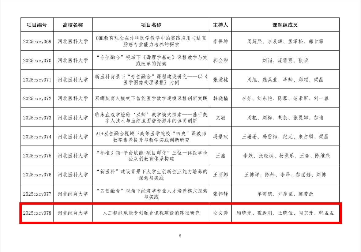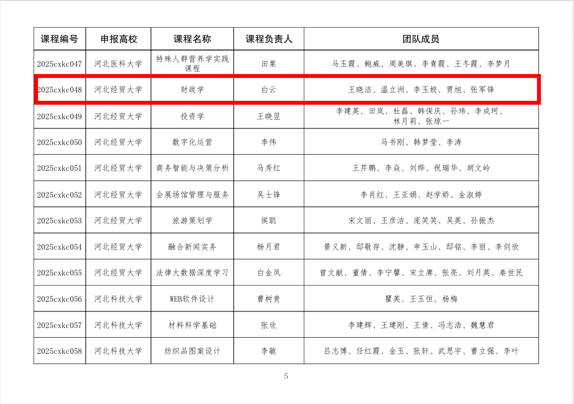 近日,河北省教育厅公布了2025年省级创新创业课程、教改项目立项建设名单,财政税务学院收获颇丰!白云老师负责的课程成功入选省级创新创业课程,仝文涛老师牵头的项目获批省级教育教学改革研究与实践项目,彰显了学院在创新创业教育与教学改革领域的扎实功底与创新突破。