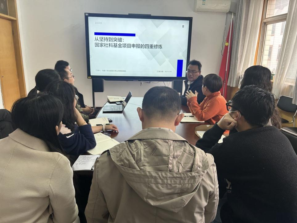 为进一步提升财政税务学院教师的科研能力,助力国家社科基金项目申报,2025年11月6日下午,财政税务学院与河北省财政经济与公共政策研究基地联合开展了题为“从坚持到突破:国家社科基金项目的四重修炼”的专题分享会。本次会议特邀公共管理学院高星博士担任主讲嘉宾,财政税务学院副院长仇晓洁及专任教师参加了此次交流活动。
