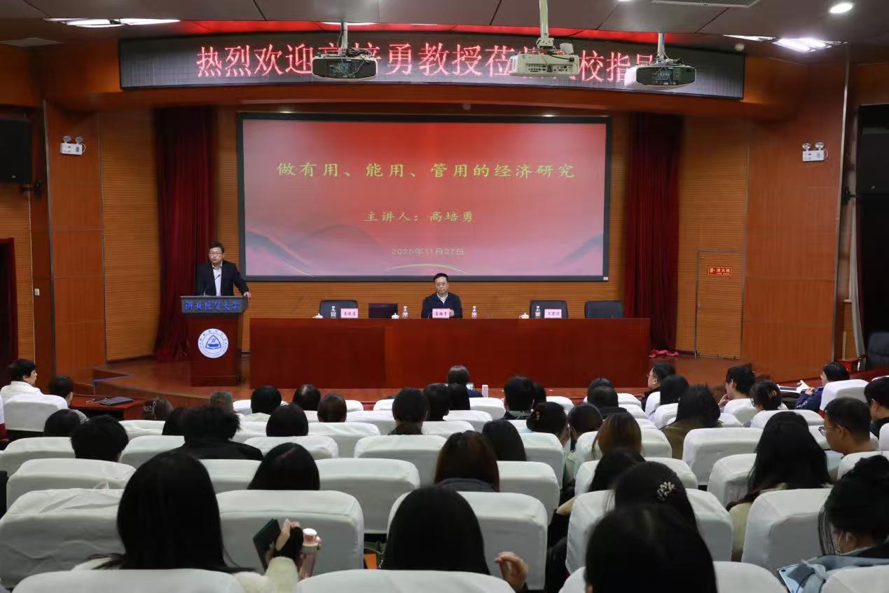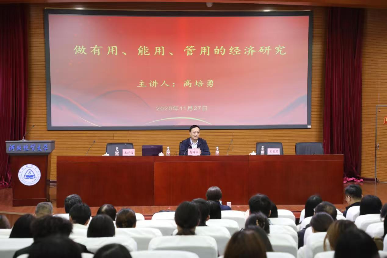 为增强我校经济学科研究的实践导向,促进学科建设与国家发展战略需求紧密结合,2025年11月27日下午,河北经贸大学科研处、财政税务学院以及河北省财政经济与公共政策研究基地联合举办学术讲座,特邀中国社科院学部委员、国家一级教授高培勇担任主讲嘉宾。高培勇教授围绕“做有用、能用、管用的经济研究”这一主题展开深入讲解。校党委常委、副校长王重润主持,财政税务学院院长王晓洁出席,来自全校各学院的教师代表、研究生代表共计二百余人参加了本次学术交流。